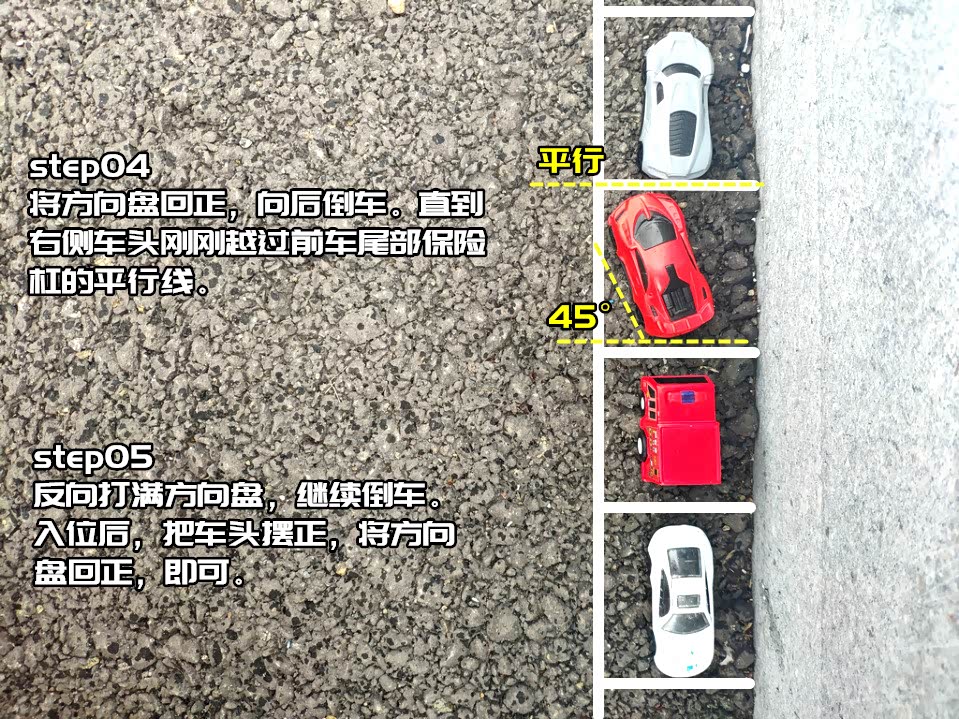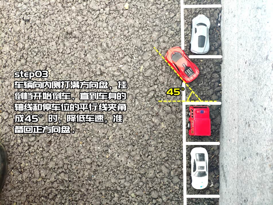 这是我们日常停靠路边停车位最常见的停车方法。由于停车位前后距离狭窄,而且路边还有路基所以找不准窍门,很容易就会造成前后车辆的刮蹭或者车轮与路基刮蹭。