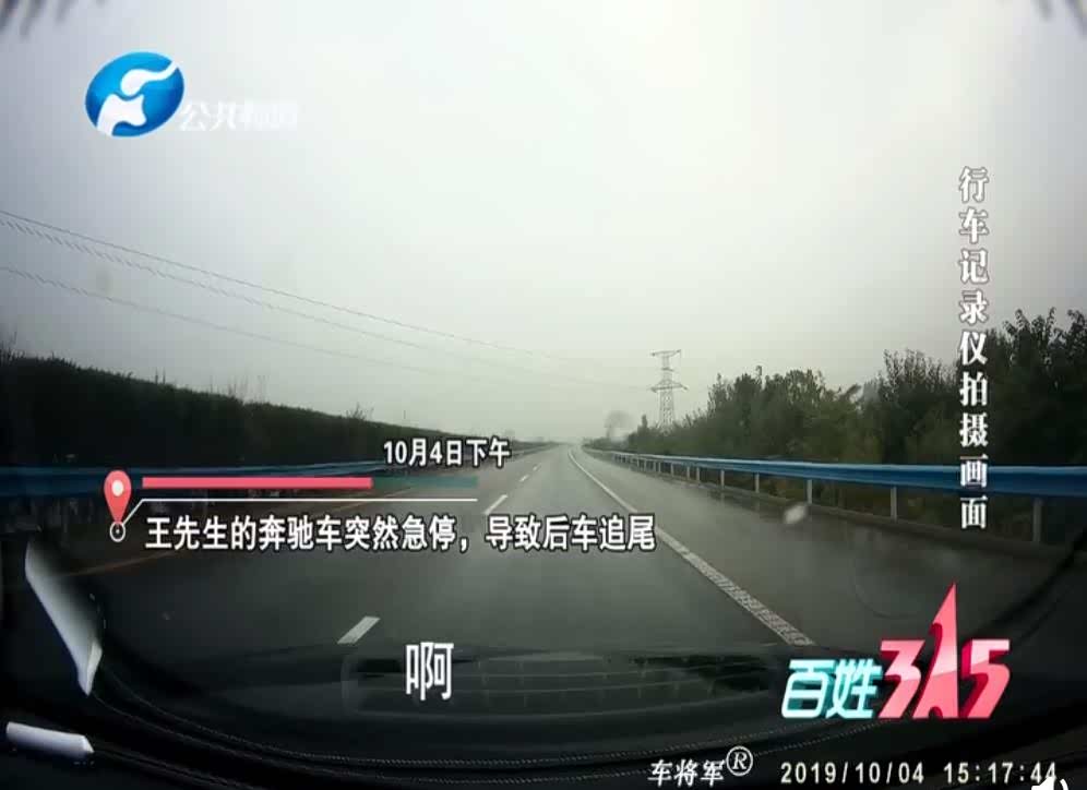 行车记录画面显示,王先生驾驶奔驰车在高速路上正常行驶,突然车辆减速刹停,大约两秒后,后车撞上了王先生的奔驰车,导致追尾事故。并且可清晰看到,奔驰车前方并没有其他车辆出现在画面上。