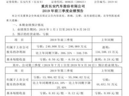 10月14日晚间,长安汽车发布《2019年前三季度业绩预告》,今年前三季度,长安汽车归母净利润预计亏损24亿-28亿元,相比上年同期的盈利11.63亿元,预计同比下降306.35%-340.74%。
