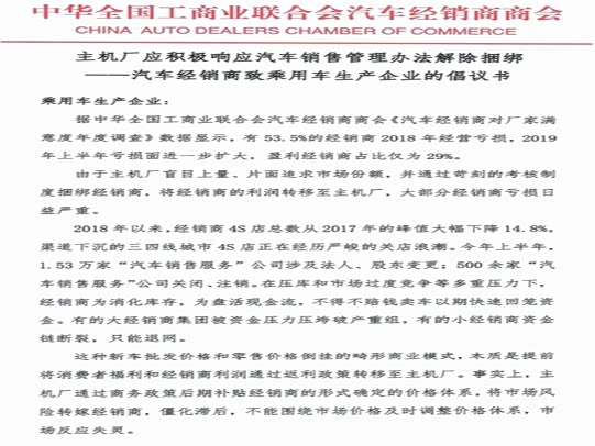 信中表示,据中华全国工商业联合会汽车经销商商会《汽车经销商对厂家满意度年度调查》数据显示,有53.5%的经销商2018年经营亏损,2019年上半年亏损面进一步扩大,盈利经销商占比仅为29%。