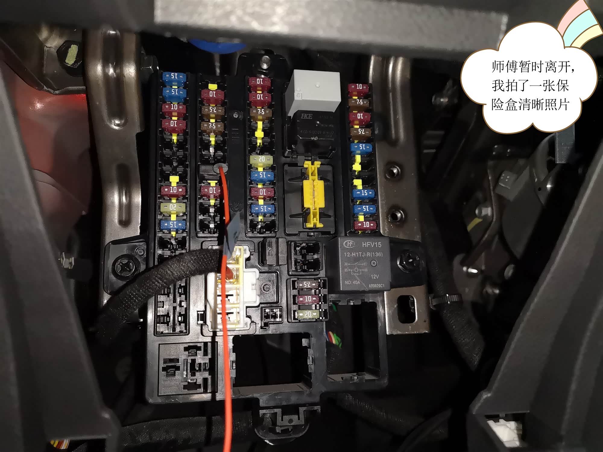 我的原车是没有自带行车记录仪的,而是17年购车不久后安装中控大屏时,店家附送一套的记录仪,没有具体品牌名称,更别说什么生产地址,合格证外包装这些了。具体使用近两年了,只能说效果还将就可以吧。不过一直都有想法换一款夜视,超广角,1080P的新款行车记录仪。这次很偶然获得这款全新的行车记录仪(具体品牌型号就不明说了,以免广告之嫌),大约市场价值是500元左右。新款记录仪的各种功能就不一一细数,具体在图片展示及说明里面会有详细叙述。10月8日发货,到10月14日到货,六天时间果然是邮政速度。当天立即安装体验使用。因为这款新的记录仪是插保险盒的,不是连接点烟器。本人对汽车保险盒这些完全不了解。为了安全还是选择了外面的专业店面安装。安装费用50元,过程约半小时左右。过程简单,我还是大致说一下,拆开方向盘左下侧的储物盒,里面就是保险盒位置。拆下来的储物盒背面贴有保险盒每个插针位是对应汽车不同部位。然后把记录仪的插线插上对应的保险盒位置。安装记录仪在前挡玻璃上。从后视镜背后走线到驾驶室A柱左侧到保险盒那里。然后恢复内饰。完成。