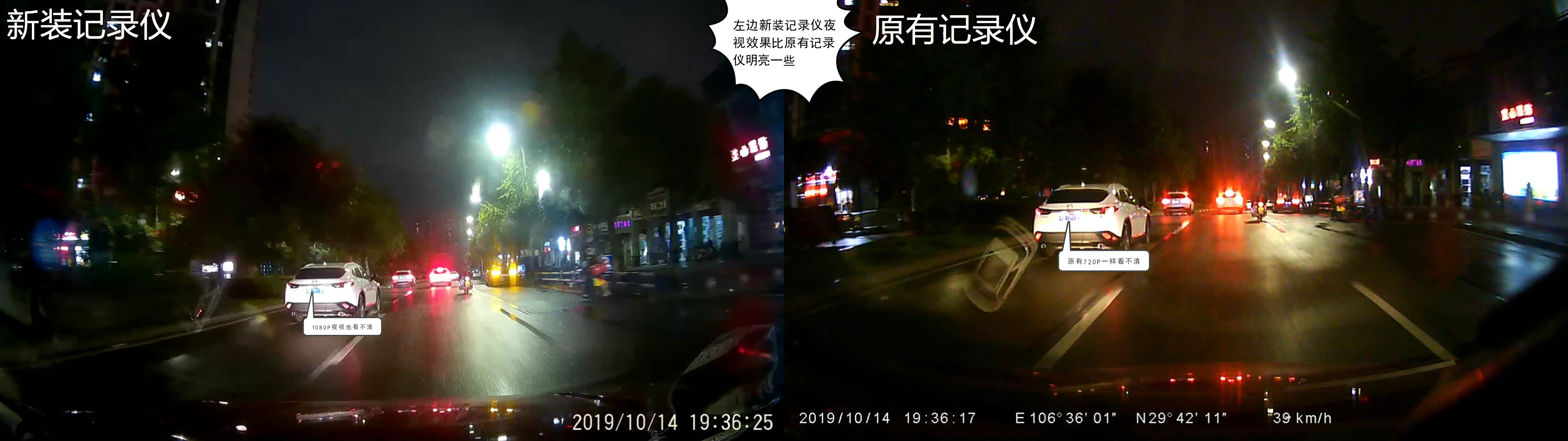 重点来了。最后的视频画面对比。雨夜行车,光线环境很差。对记录仪是一个极大考验。可以看出来这画面都比较昏暗。但是新装记录仪要稍微明亮一点。