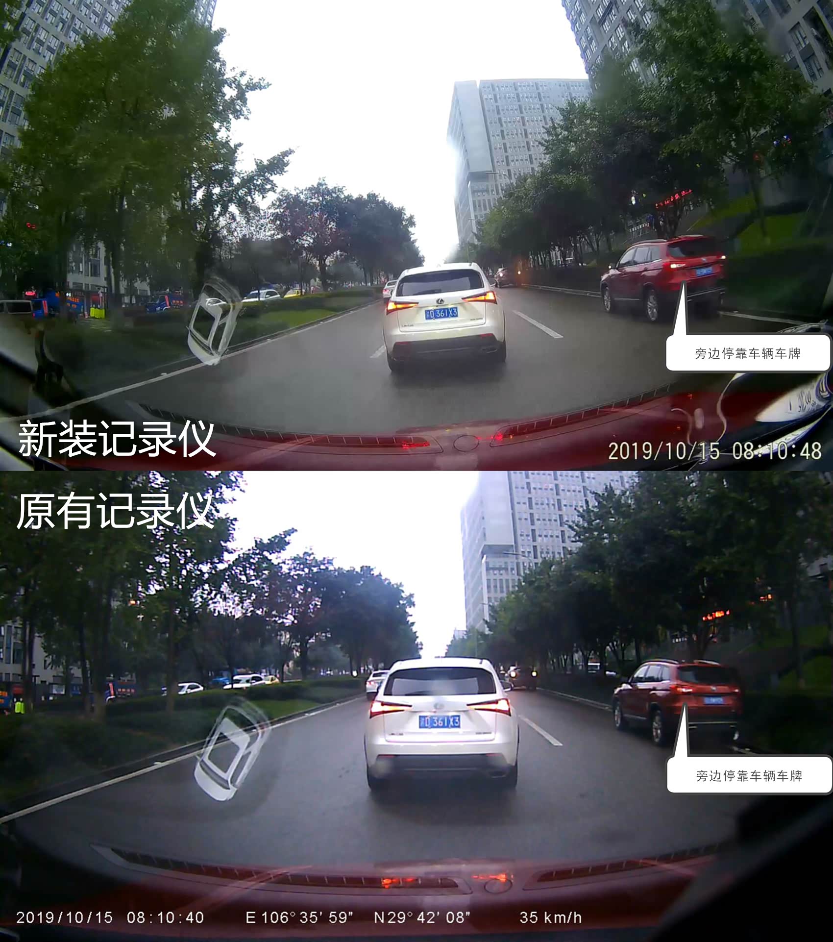 行驶过程的视频截图画面,。前方的雷克萨斯车牌都能看清,但路边停靠的红色SUV车牌是看不清的。两款都是一样。