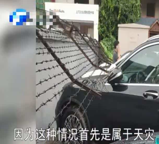 车主有点懵,立马赶往4S店查看具体情况,发现车子停靠在露天。旁边没有任何遮挡物,只有墙上的铁丝栏杆,而车子就是被这个栏杆砸了。据了解是因为当时下着大雨已经刮着大风,直接将铁栏杆吹倒了,导致这辆新车多处被划伤,露出了底漆,直接新车变成了破车。