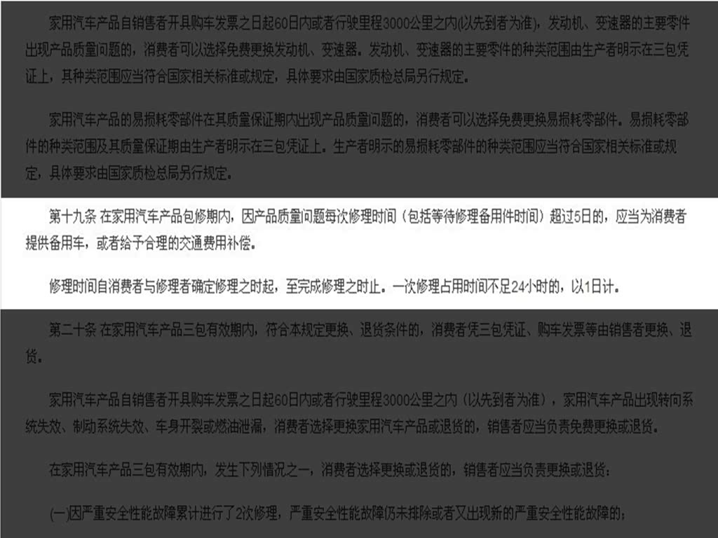 很多车辆维修需要几天甚至十几天的时间。而没有车辆的消费者自然对出行造成了一定影响,所以出行方式和费用成为两方争议的热点。对此三包法有规定,车辆一次性修复超过5天时间的,由经销商为消费者提供代步车或者出行补助。