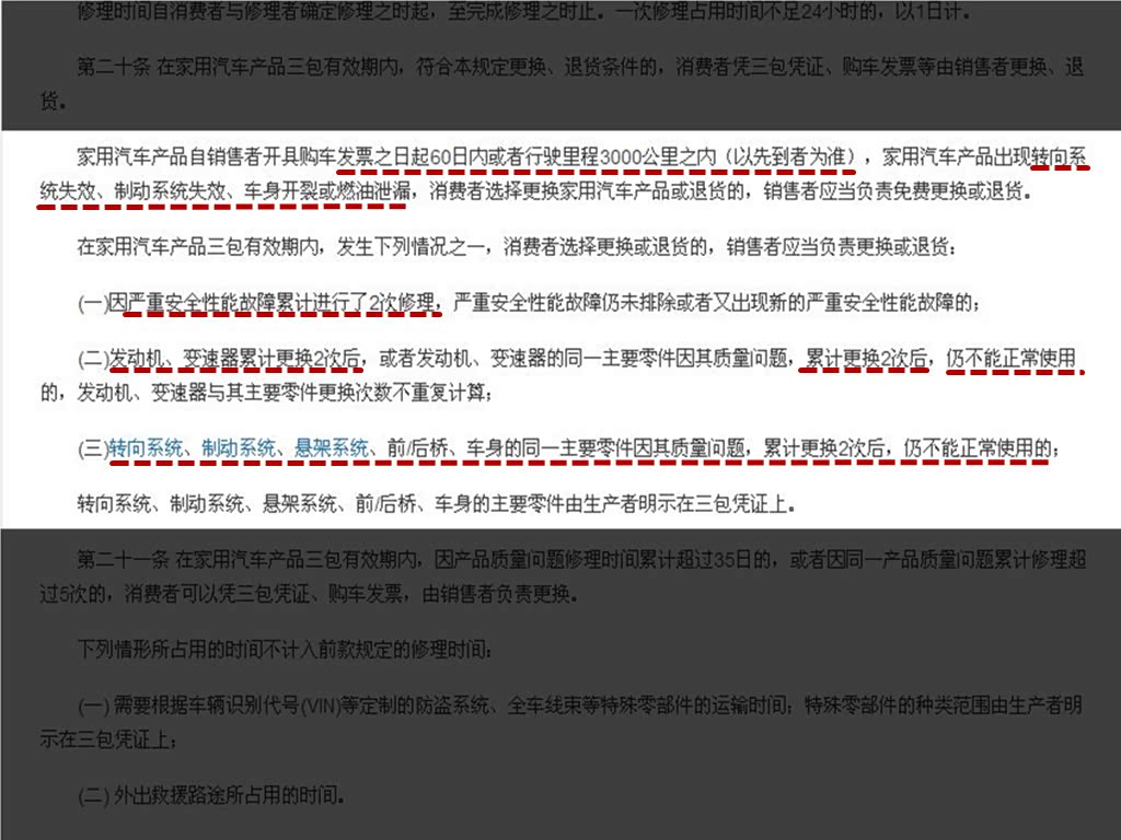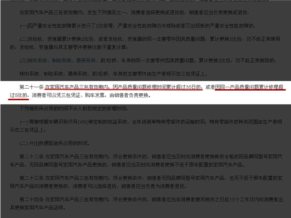 而对于很多质量问题,尤其是发生在核心部件发动机、变速箱的质量问题,很多车主多会要换车。而三包法依然有所规定,只有在车辆因质量问题累计维修时间超过35日或者同一质量问题维修5次依然不能正常使用的方可退换车。
