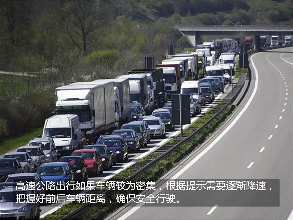 3.高速车辆较多,如果赶上节假日出行车辆更加的密集,所以注意降速也要掌握好前后车辆的车距,保持安全距离。