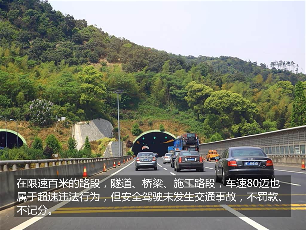 在限速为百米的路段时,例如隧道、立交桥、施工路段等等。即使车速80迈以下也属于超速违章行为,但是在没有造成交通事故的前提下,确保安全驾车,车主不会被扣分和罚款。虽然规则有了宽限,但是我们也要注意,尽量不超速,不然危险来临时谁也想不到。