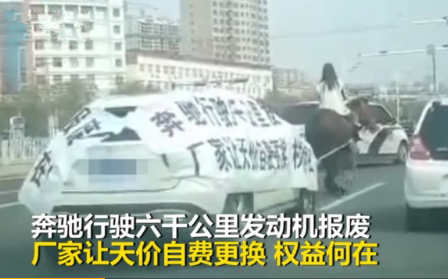 近日,在山东滨州,刘先生因维权找朋友骑马拉着奔驰车游街,引发社会关注。视频显示,一骑马女子身后拉着一辆白色奔驰车,奔驰车上的维权横幅写着“奔驰行驶六千公里发动机报废,厂家让天价自费更换,权益何在”。