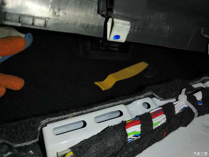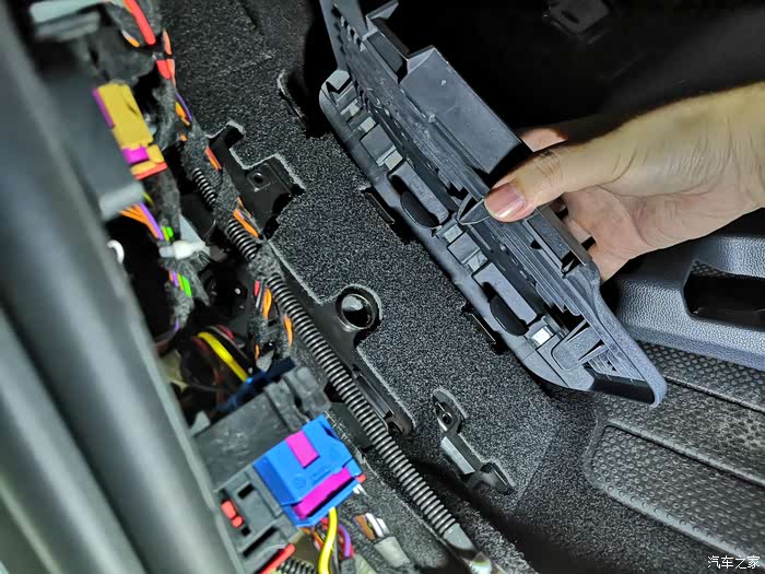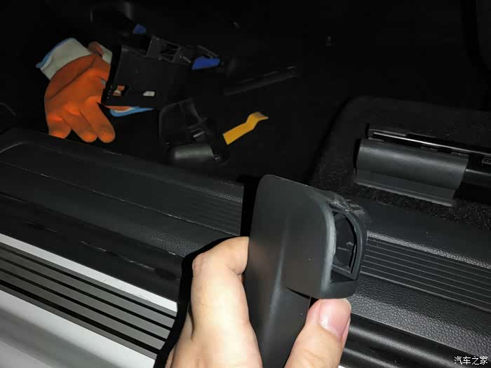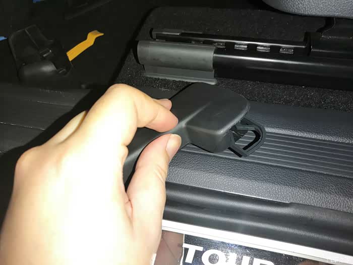 首先安装工程量最大的休息踏板。先把驾驶侧的门槛条掰起来,用塑料撬棒从地毯和门槛条的接缝处撬开一点,手指能伸进去就行,然后两手合力稳着向上拉,不用太担心会掰断,因为卡子都是金属的,直接卡在车厢底盘上的缺口里,比较结实。