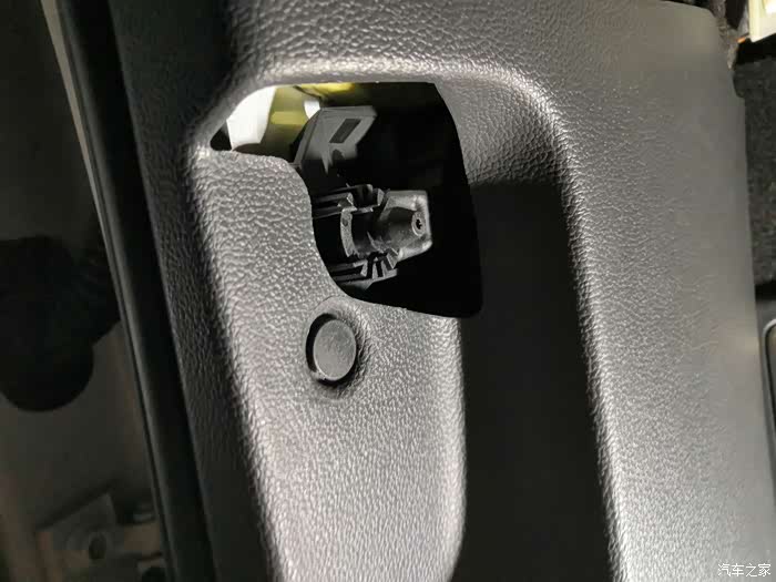 然后卸掉引擎盖拉手所在的侧护板。卸掉这块护板,首先得把引擎盖拉手拆下来。方法很简单,正常拉动引擎盖拉手到底,再用一把小一字螺丝刀把图中所示的卡环拨开,拉手就可以从底座上取下来了。