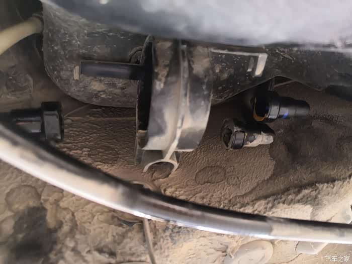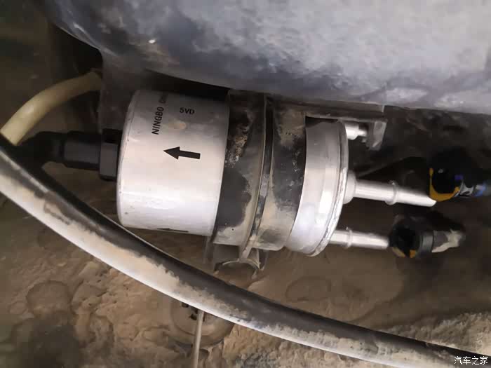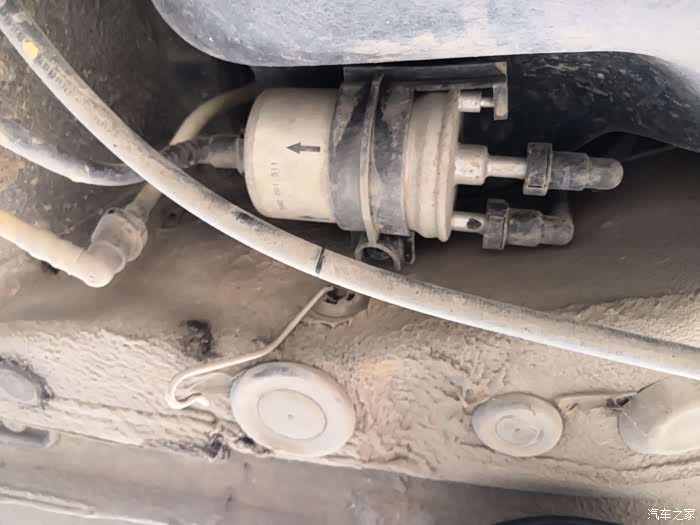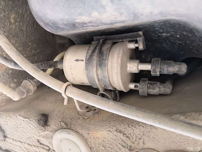 升起车辆后,我们在右后轮附近位置,可以找到这个汽油滤清器,腰身螺丝卡口,两端有三个接头。