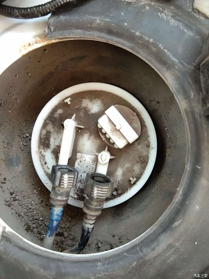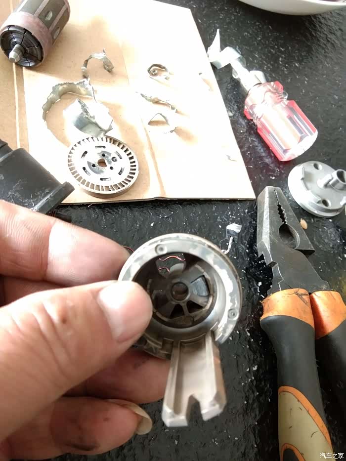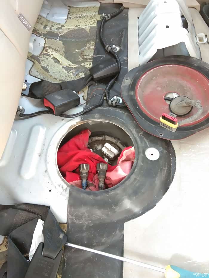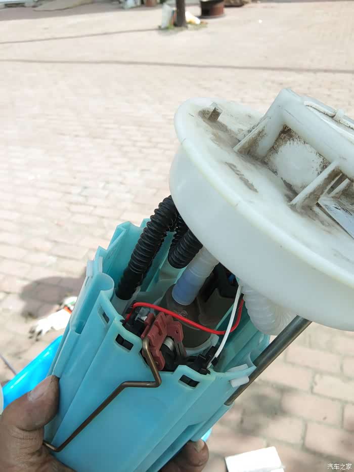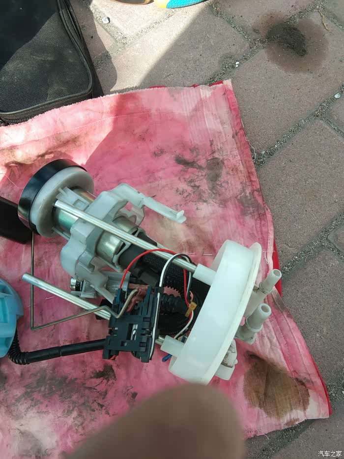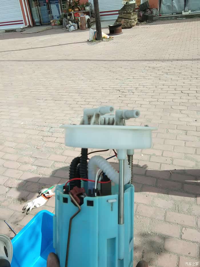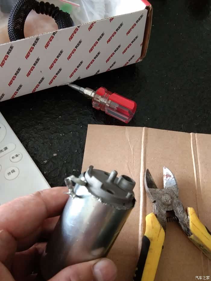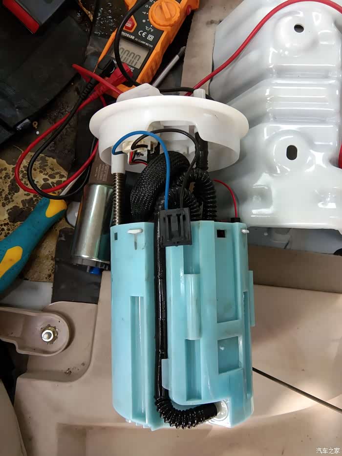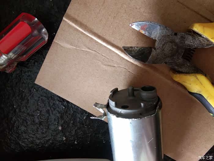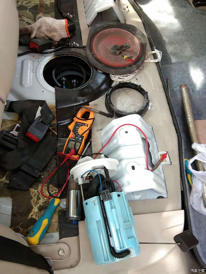 所用工具,螺丝刀,万用表【上次干活后放车里的,居然用上了】,下面是一个六分的铁管【平时当做轮胎扳手的加长杆用,这次用太和一块路砖敲开的上盖】,泵体旁边的就是新泵芯了。