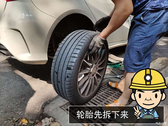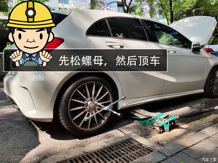 从右后轮下手,先拆螺母,在顶千斤顶。