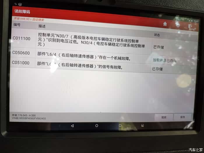师傅拿出诊断电脑,一顿操作猛如虎,读取了错误代码。右后轴转速传感器问题。