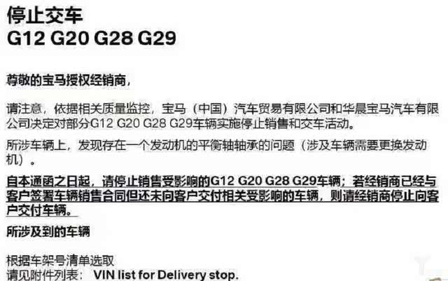 据该报道称,宝马车群主流露出宝马致经销商的一封邮件显示,依据相关质量监控,宝马(中国)汽车贸易有限公司和华晨宝马汽车有限公司决定对部分新7系(G12)、新3系的标轴版(G20)、新3系长轴版(G28)、新一代宝马Z4(G29)车型停止销售和交付。