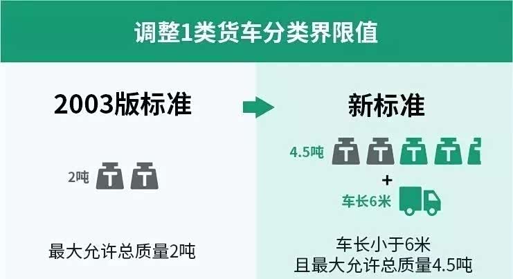 第二指标:车长和允许总质量与老版标准相比,这里有个重要的变化,就是不再按行驶证上的准载吨位,而是直接按行驶证上的车货总重。在高速入站时进行计重,禁止超载超限车辆进入高速公路。其中4.2米蓝牌轻卡成为1、2类车型的分界标新的车型划分标准中,将1类和2类货车分类界限值,确定为车长小于6米且允许总质量4.5吨。