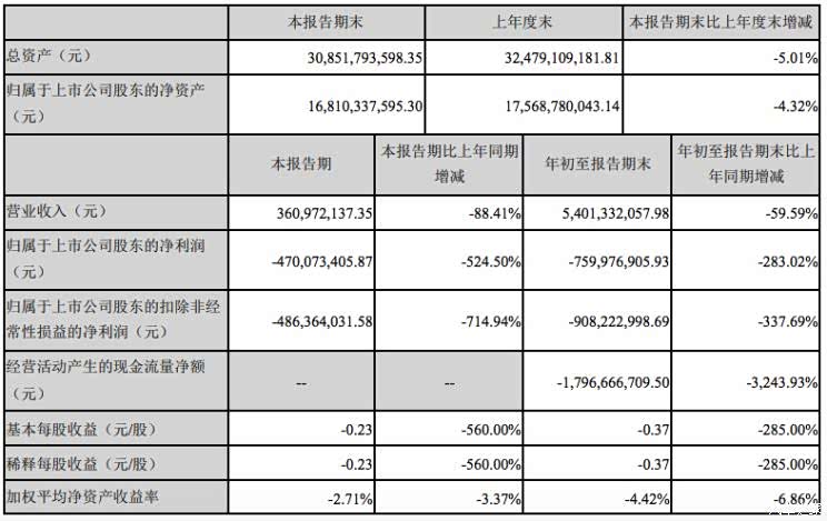 10月28日,众泰汽车发布财报显示,今年第三季度营业收入为3.61亿元,较去年同期同比下滑88.41%,归属上市公司股东净利润亏损4.7亿元,同比下降524.50%;前三季度公司营业收入为54.01亿元,较去年同期下滑59.59%,归属上市公司股东净利润为-7.59亿元,较去年同期同比下滑283.02%。