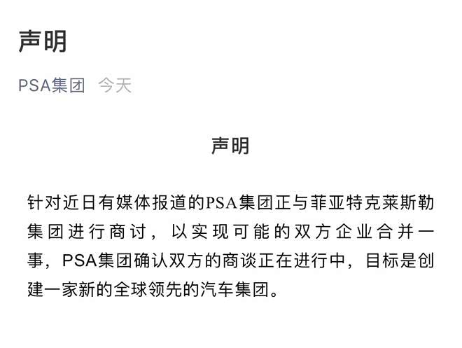 10月30日,有外媒报道称标致雪铁龙(PSA)正就与菲亚特克莱斯勒(FCA)的合并事宜进行谈判。当天晚些时候,PSA集团官方对这一消息予以确认。PSA表示,双方的商谈正在进行中,目标是创立一家新的全球领先的汽车集团。双方的合并若能成功,一家价值500亿美元的汽车联盟也将诞生。