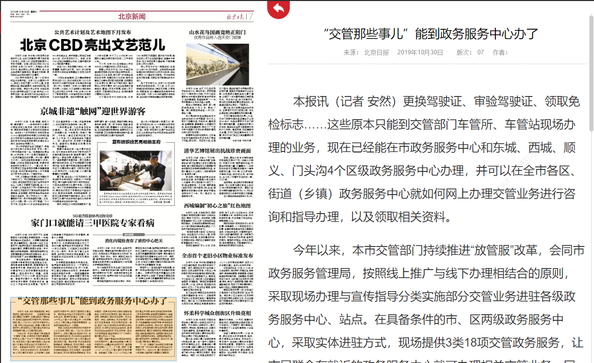 更换驾驶证、审验驾驶证、领取免检标志……这些原本只能到交管部门车管所、车管站现场办理的业务,现在已经能在市政务服务中心和东城、西城、顺义、门头沟4个区级政务服务中心办理,并可以在全市各区、街道(乡镇)政务服务中心就如何网上办理交管业务进行咨询和指导办理,以及领取相关资料。