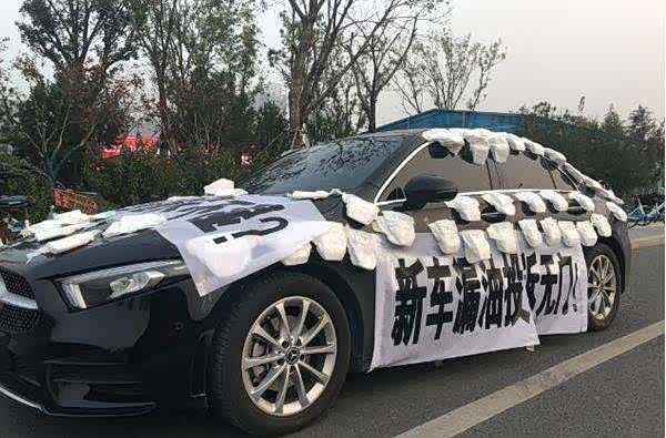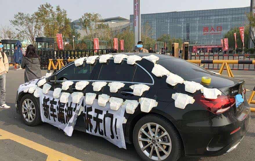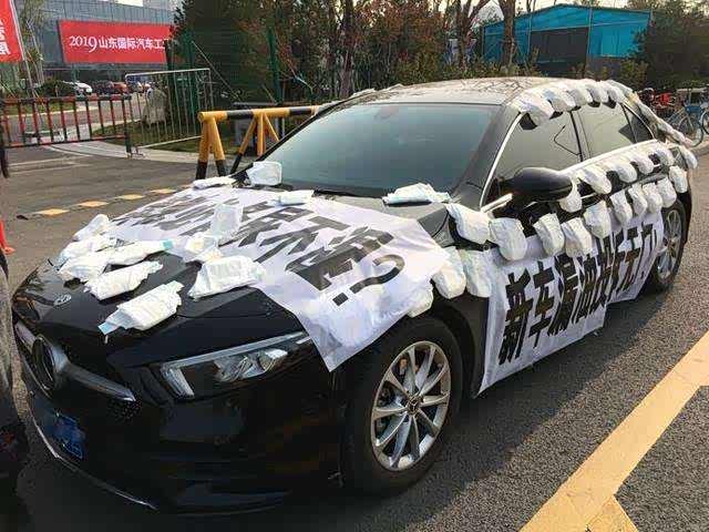 11月8日,济南市槐荫区滨州路附近出现一辆贴满尿不湿的奔驰车,车身上贴着写有“买奔驰必备尿不湿”“新车漏油投诉无门”等字样的横幅。