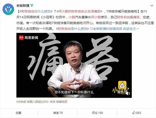 昨日,小鹏汽车宣布成功签署C轮融资,总金额为4亿美元。此次引入新晋战略投资伙伴小米集团,同时还获得了招行、中信以及汇丰银行等多家中外银行总额达数十亿人民币无抵押信用贷款。而11月14日,在《小冠军》栏目中,小鹏汽车董事长何小鹏表示,自己财务自由后痛苦、空虚、彷徨。和俞永福吃7块钱快餐只能偷偷吃很开心。有钱后买过一条远洋船,这其实也不过是开拓人生视野的一个玩具。