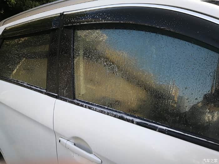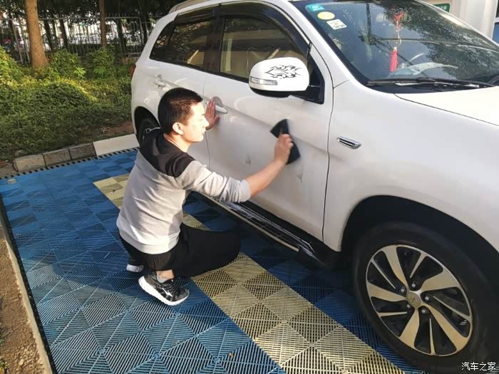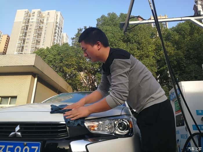 擦完以后,在用清水冲洗,冲洗过程就没拍了,冲完就得拿抹布擦水滴了,由于没提供擦水抹布,只能拿平常放在车子中控上抹布用了~