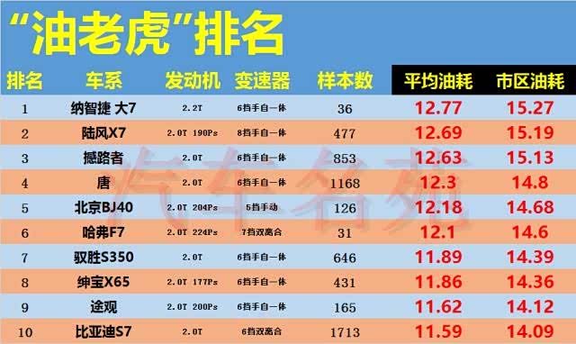 在传统的认知中一般是美系车,别克,雪佛兰之类SUV的比较耗油。可从榜单上我可以看到前9位只有途观和撼路者是合资品牌,其他的均为自主品牌。特别是纳智捷大7不到10万的车,百公里油耗竟然达到了15.27L,难怪网友们都调侃是中石化的合作伙伴。