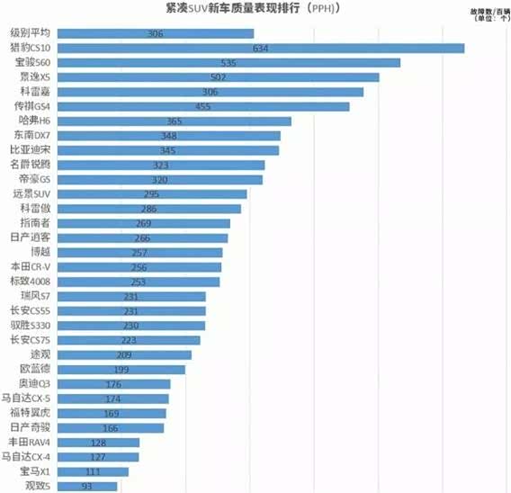 可以看到,紧凑型SUV平均PPH值为306,有10款车型的质量高于平均水平,除了雷诺科雷嘉,其余9款全是国产车,质量让人担忧。其中,猎豹CS10排名榜首,百车故障数高达634!质量表现最差,值得一提的是,该车在消费者投诉榜上也名列前茅,另外宝骏560和景逸X5的质量也是有待商榷。