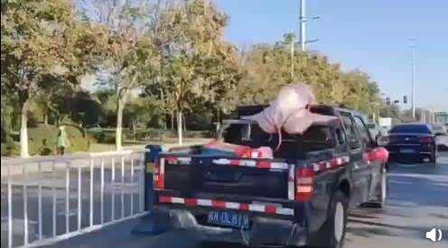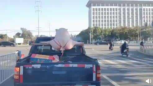 北京市公安局发布一段视频,一头生猪劈叉被绑皮卡车顶。警方提示,一般这个类型的皮卡,载重都在1千公斤以下,而不满1千公斤的小型货运汽车载货,高度从地面起不准超过2米,宽度不准超出车厢,长度前端不准超出车厢,后端不准超出车厢50厘米。“二师兄”已经超出车厢趴在了顶上,又难受,又违规。
