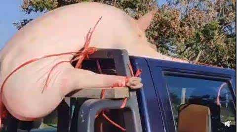 不少网友也拍到了这一奇葩行为,车顶上面赫然有一只劈叉的猪,并且这猪的姿势还很妖娆,让人一下子惊呆了,甚至让人调侃:这姿势挺妖娆