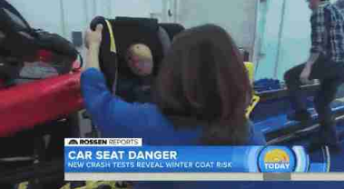 在实验中一个穿着冬天外套的假婴儿,面部朝前坐在儿童安全座椅里,模拟以每小时30英里(约等于48公里)行驶的汽车发生撞击时的情景。