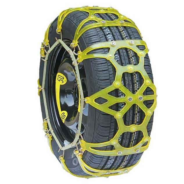 2)牛筋链---这是一种PVC、PP、PT的化学混合物,是近来开发的一种比较现代的车辆防滑设备。打开后是一整体象围巾一样中间是数个菱形图案上面布有数枚钢钉,安装方便只要将防滑链平铺在地上,将车慢慢开上去再兜起来固定在驱动轮上即可。外观也很漂亮,缺点是容易断裂。