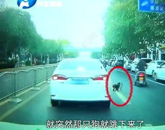 郭先生介绍,在事发时,他在东风路中州大道口正常行驶,车速也不高。路边有一辆电动车,骑电动车男子带了一只宠物狗在车上,不料突然间狗就跳了起来,直接跳到了郭先生前车的车头上,前车司机顿时急刹车。