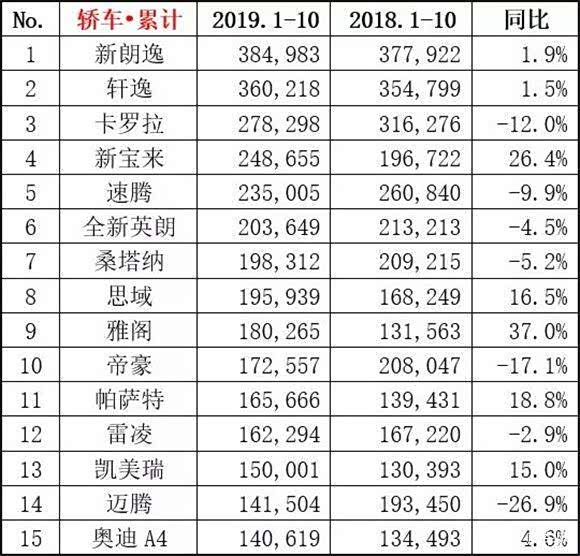 今年国内车市进入最后的冲刺时刻,今年哪款轿车销量比较好?据乘联会日前公布的汽车销量数据显示,2019年1-10月国内乘用车累计1662.6万辆,同比下降8.3%。而在轿车销量方面,2019年1-10月累计销量819.8万辆,同比下降9.4%。下面我们看看今年1-10月销量排名前十五的轿车的销量情况: