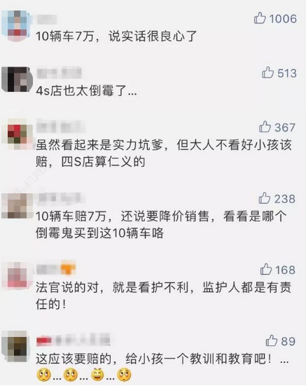 12月3日,经过桂林市临桂区人民法院立案前调解,双方自愿放弃评估损失,由赵某夫妇一次性赔偿汽车销售公司7万元当场了结。赵某夫妇表示要吸取教训,以后带孩子出去不能放松警惕,法官也提醒“孩子还小”、“他还不懂事”等理由,并非是父母逃避法律责任的借口。外出时要加强对孩子的管护,在平时的家庭教育中引导孩子要爱护财物,避免再“划车”闯祸。