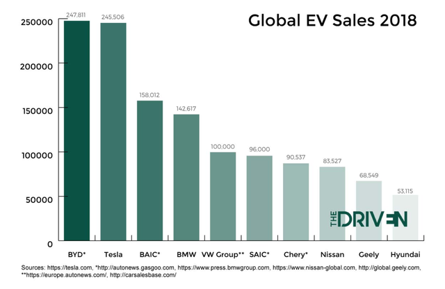 比亚迪和特斯拉长期占据全球电动车(包括纯电动和插电式混合动力车型)销量排名前两名,累计销量呈现你追我赶的态势。据美国电动汽车媒体TheDriven统计,2018年,全球电动汽车排行榜前两名为比亚迪和特斯拉,两者年度销量十分接近,分别为247811辆和245506辆,远超过第三名雷诺-日产联盟的150374辆。