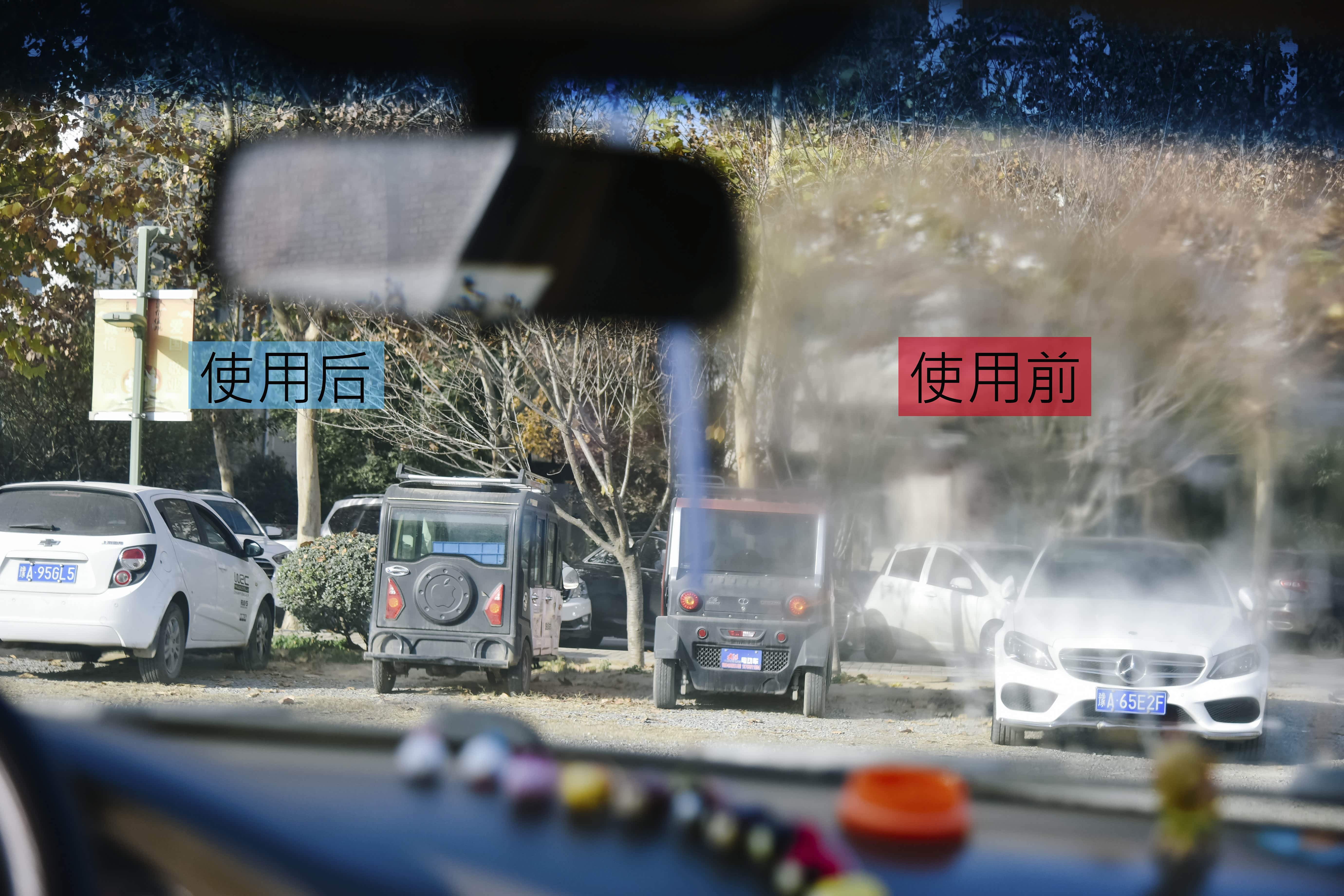 实验结果:副驾驶侧的玻璃变的比较模糊,明显的干扰视线,主驾驶侧涂抹过防雾剂的玻璃依然清晰透亮,说明了防雾剂确实起到了一定的作用,虽然说不上立竿见影,但对安全驾驶足以起到辅助作用。