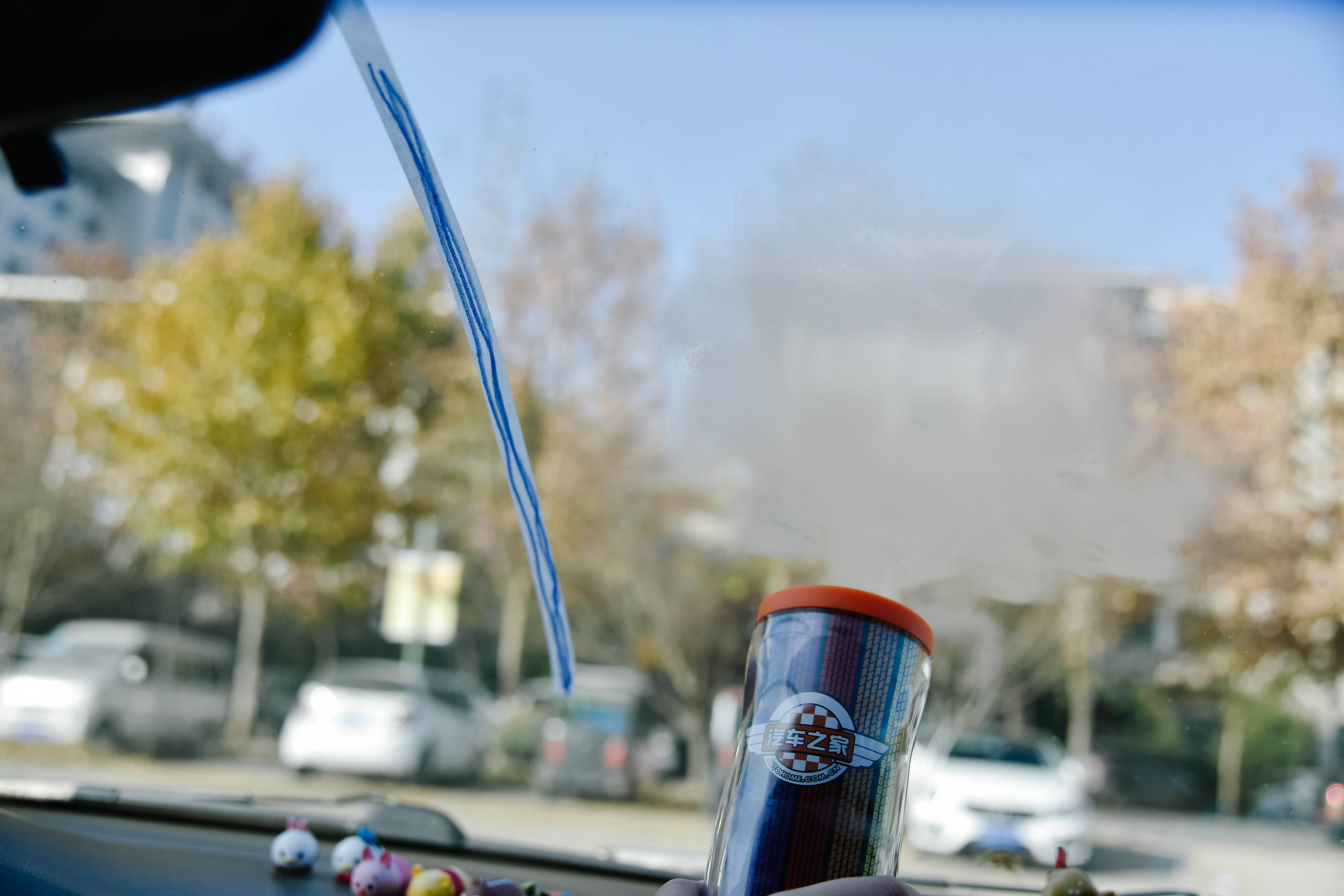 紧接着用盛满开水的杯子对着前挡风玻璃进行“熏陶”,可以明显看到,由于温差的原因,未涂抹防雾剂的区域水蒸气很快就凝集在了挡风玻璃,变的模糊一片,再次用同样的方法对准涂抹过防雾剂的区域进行试验,静止1分钟左右,效果如何呢?