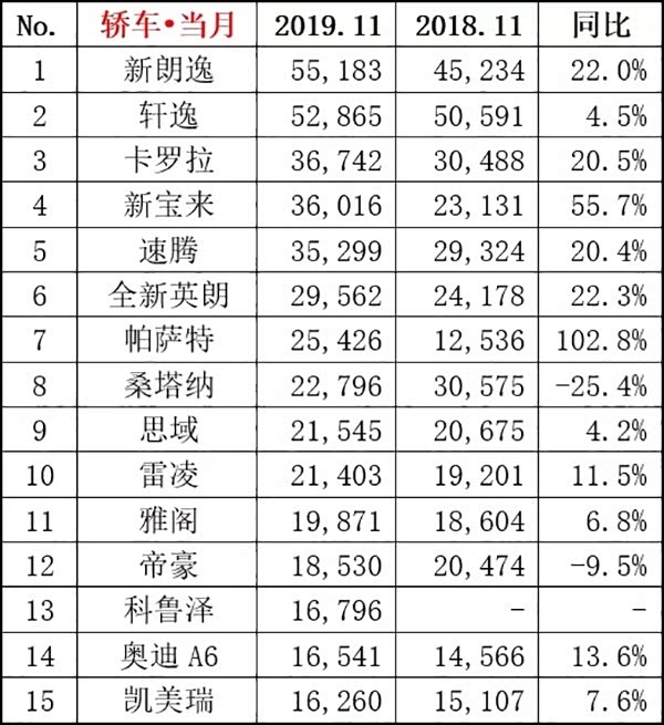 大家熟悉的大众朗逸和日产轩逸在每月的销量基本都是前三,在11月份的销量分别为55183辆和52865辆,同比增长为22%和4.5%。不过随着第十代日产轩逸的到来,大众朗逸无形中存在了很大的压力,在11月份两者的销量仅相差2000余量。