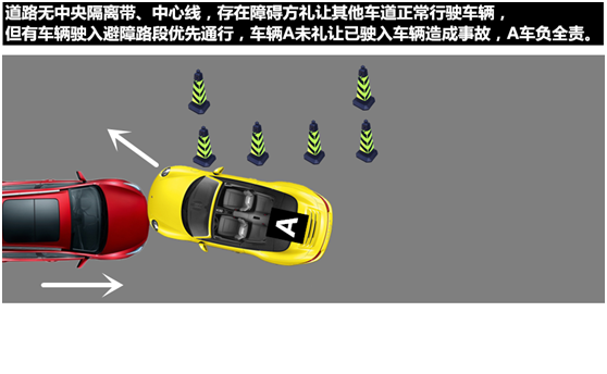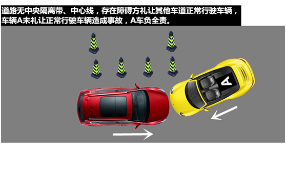 事故情形八:车辆行驶在未设有中心隔离带,也未喷涂中心线的道路时,且无障碍方车辆未驶入,存在障碍路段行驶车辆已经驶入避障路段,此时未驶入方应礼让已驶入车辆,若因未礼让造成车辆剐蹭事故,未礼让车辆(A车)全责。