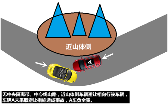 事故情形九:车辆行驶在未设有中心隔离带,也未喷涂中心线的狭窄山路时,遵循近山体侧车辆须礼让相向行驶车辆,若近山体侧车辆未做减速、停车等礼让措施,造成车辆事故,未礼让车辆(A车)全责。