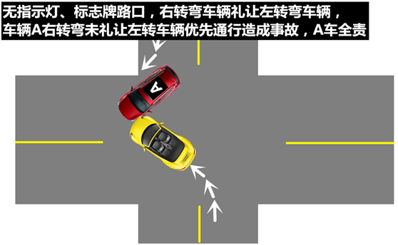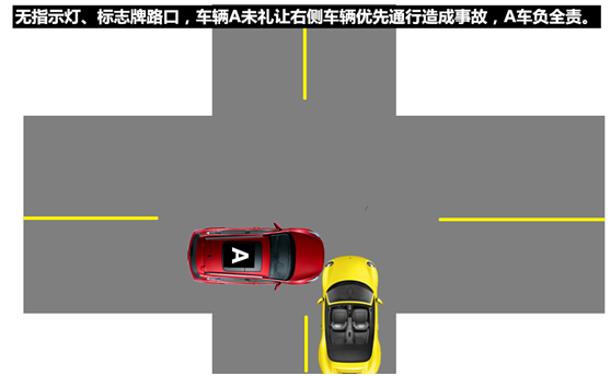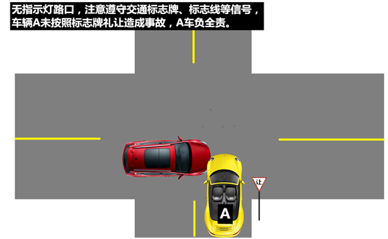 事故情形三:车辆在驶入无交通信号指示灯,亦无交通警察现场指挥的路口时,未按照交通标志牌、标志线,礼让优先通行车辆,造成刮蹭事故,未礼让车辆(A车)全责。