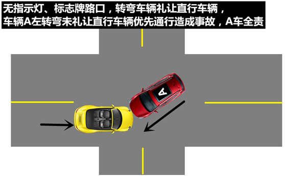 事故情形五:车辆在驶入无交通信号指示灯灯,亦无交通警察现场指挥的交叉路口时,应遵循转弯让直行原则,即在路口遇到相向而行的车辆,左转弯车辆须礼让直行车辆优先行驶,右转弯车辆则须礼让同向行驶车辆优先通过,若未礼让造成的车辆剐蹭事故,未礼让车辆(A车)全责。