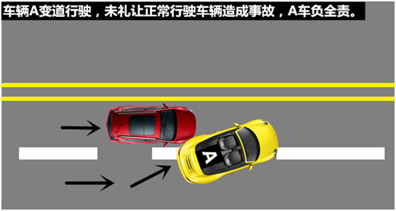 事故情形二:车辆行驶过程中未留意或未礼让后侧方驶入车道正常行驶车辆进行变更车道操作,造成与后方车辆刮蹭事故,变更车道车辆(A车)全责。