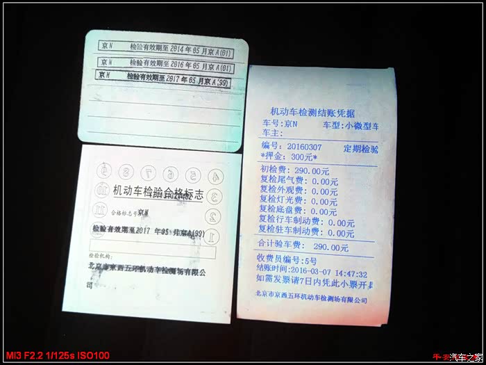 灯光是原先验车验的比较严格的一项,验车前特意自己都检查了一下,我的车前后示宽灯、刹车灯、倒车灯都换了LED灯珠,尤其前示宽灯是冰蓝色的,2年前验车时只是提了异议,没有要求改正,这次到了检测场,看到要求转车轮,拆天线,还以为会要求把灯变回原来呢,结果比2年前还容易,根本就没对我的车灯提异议,而起连雾灯都没要求开!