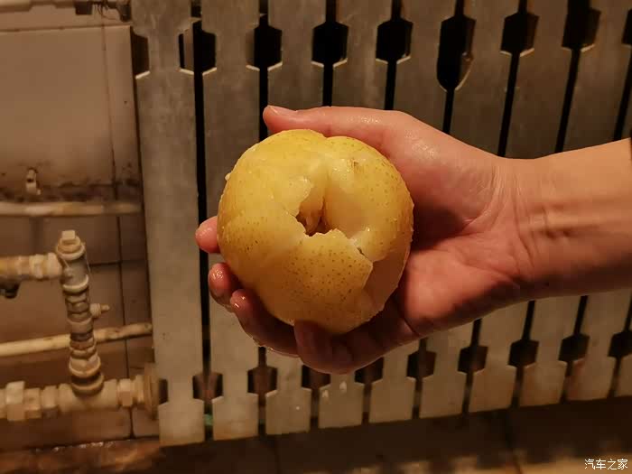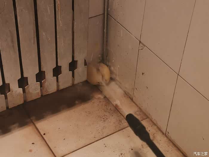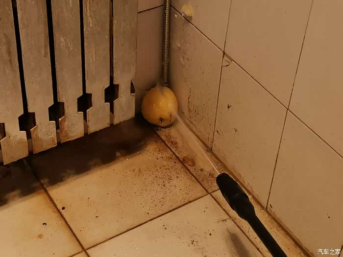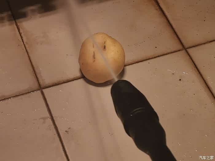 先到洗刷间连接上电源试验一下,机器瞬间发出一阵轰鸣,因为洗刷间空间小,感觉噪音好大。按下出水开关,水流喷出,调整到最细水流后觉得水压非常强劲,用水果试试,一下子就将梨子冲了个稀烂,看来洗车只能用扇面水流,否则真怕把车漆弄坏。
