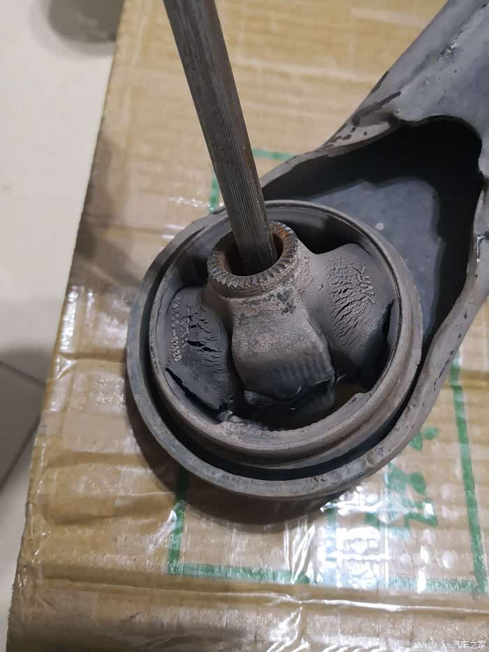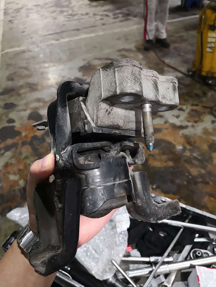 4S店维修技师拆下来的机脚胶,用手摇动非常松旷
