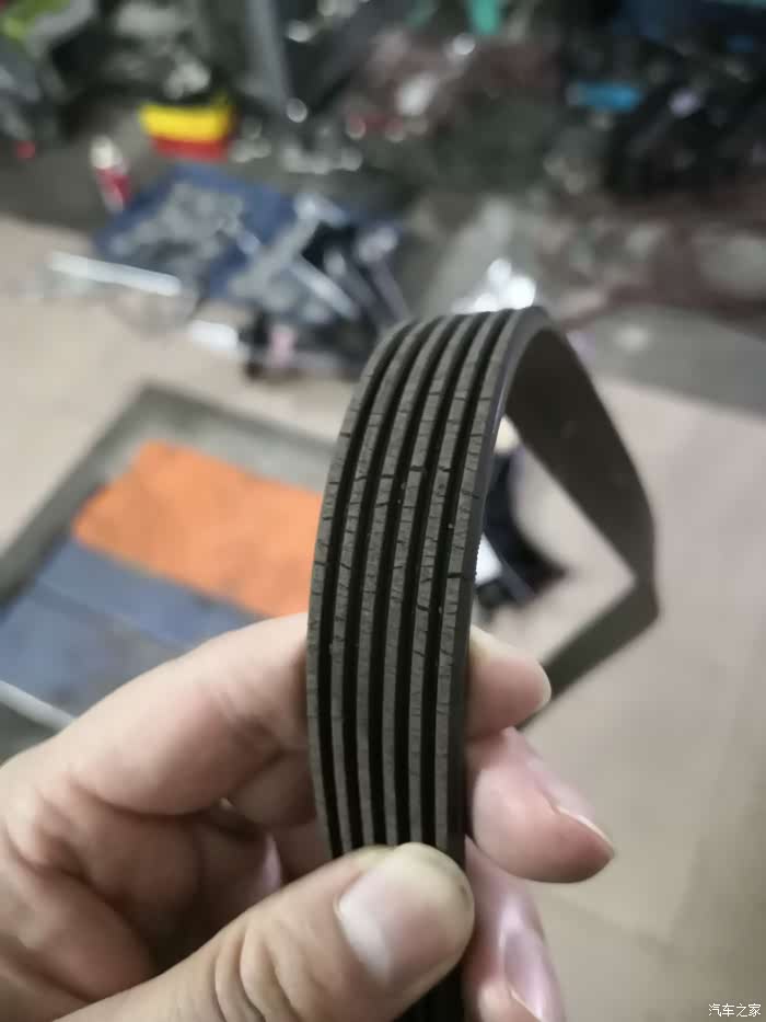 拆下来的原厂皮带有裂纹,不是很深,应该再用个几万公里没问题,有点换早了。