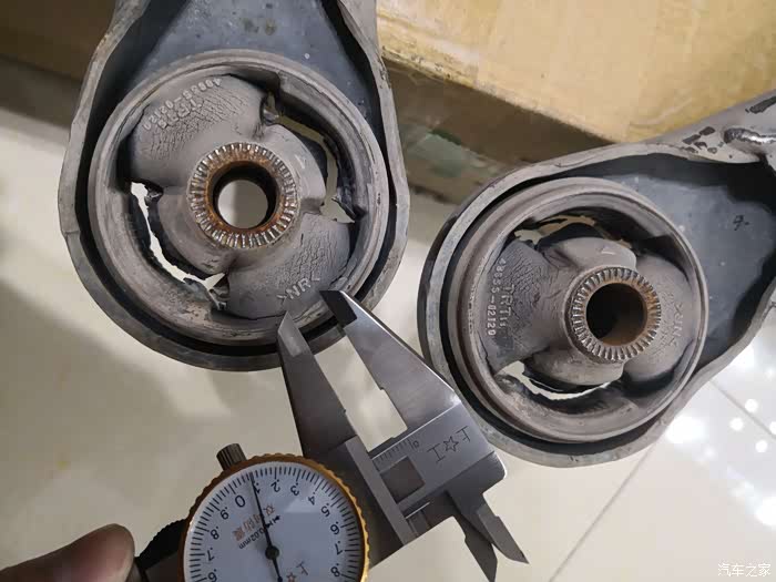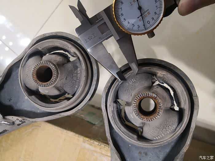卡尺测量橡胶连接处还剩下10mm左右,已断了四分之三,应该还可以继续行驶几万公里不会断裂,但是已经松旷,达到更换标准